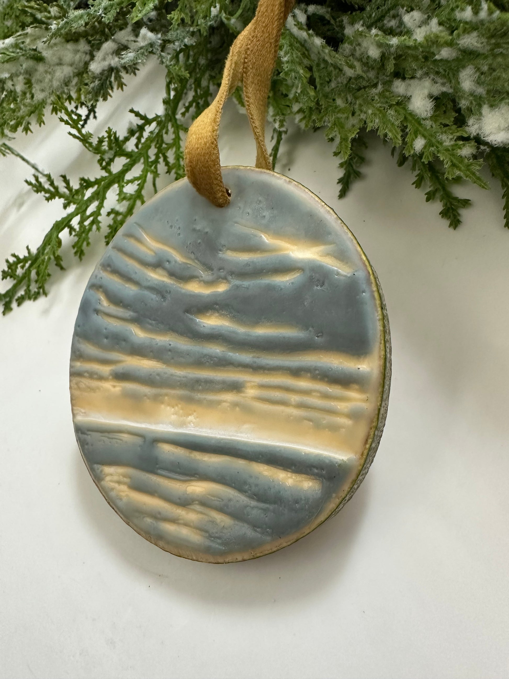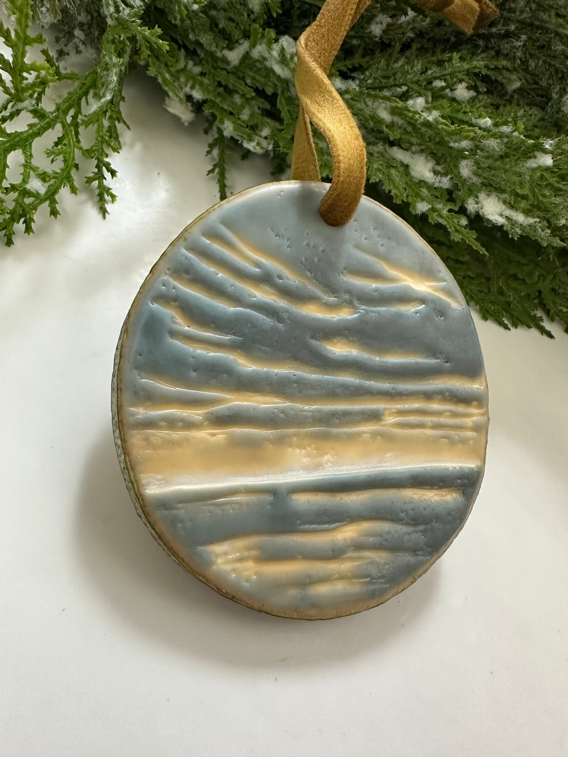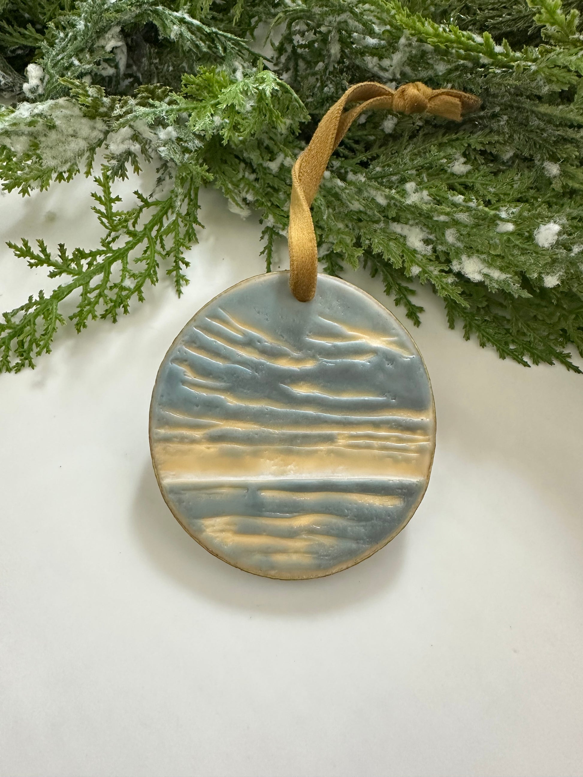 One-of-a-kind original hand-painted encaustic ornament on high-quality aspen wood rounds sourced from Aspen Rustic Creations. Dried and stabilized (so they won’t crack!), no two ornaments are exactly alike—each features its own original landscape of light in the water, waves, or clouds.