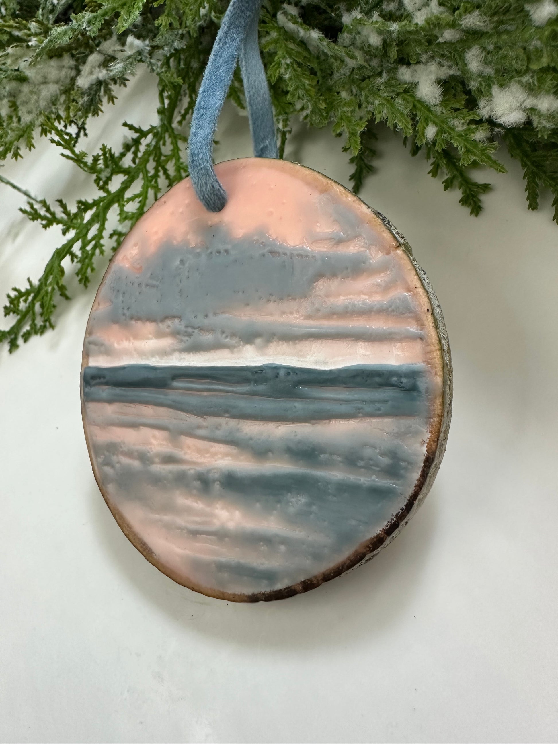 One-of-a-kind original hand-painted encaustic ornament on high-quality aspen wood rounds sourced from Aspen Rustic Creations. Dried and stabilized (so they won’t crack!), no two ornaments are exactly alike—each features its own original landscape of light in the water, waves, or clouds.