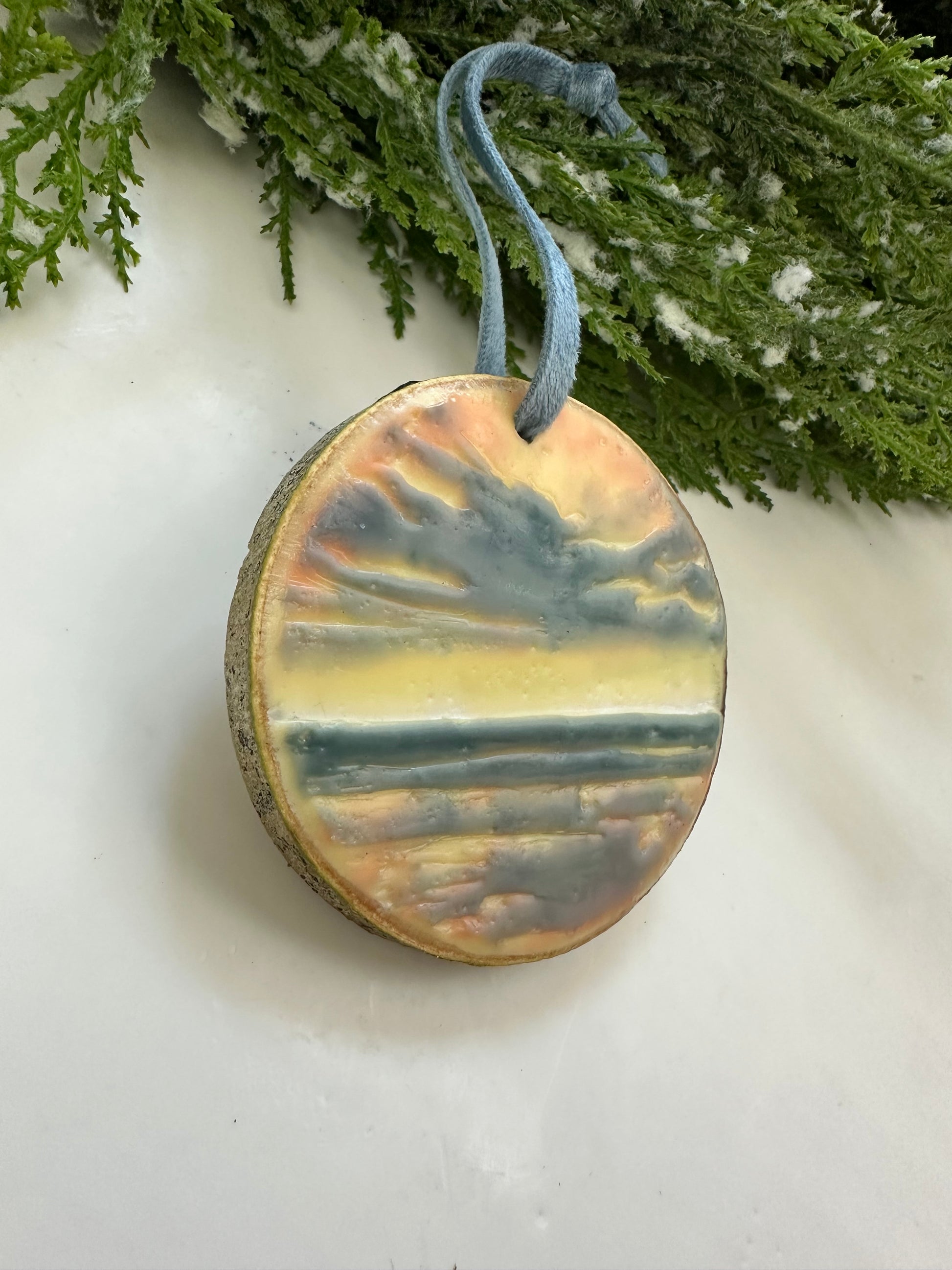 One-of-a-kind original hand-painted encaustic ornament on high-quality aspen wood rounds sourced from Aspen Rustic Creations. Dried and stabilized (so they won’t crack!), no two ornaments are exactly alike—each features its own original landscape of light in the water, waves, or clouds.
