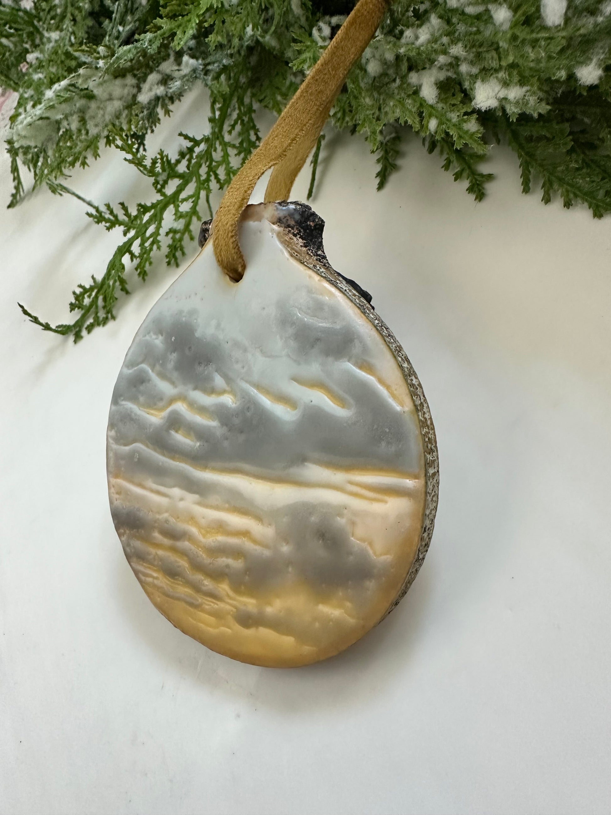 One-of-a-kind original hand-painted encaustic ornament on high-quality aspen wood rounds sourced from Aspen Rustic Creations. Dried and stabilized (so they won’t crack!), no two ornaments are exactly alike—each features its own original landscape of light in the water, waves, or clouds.