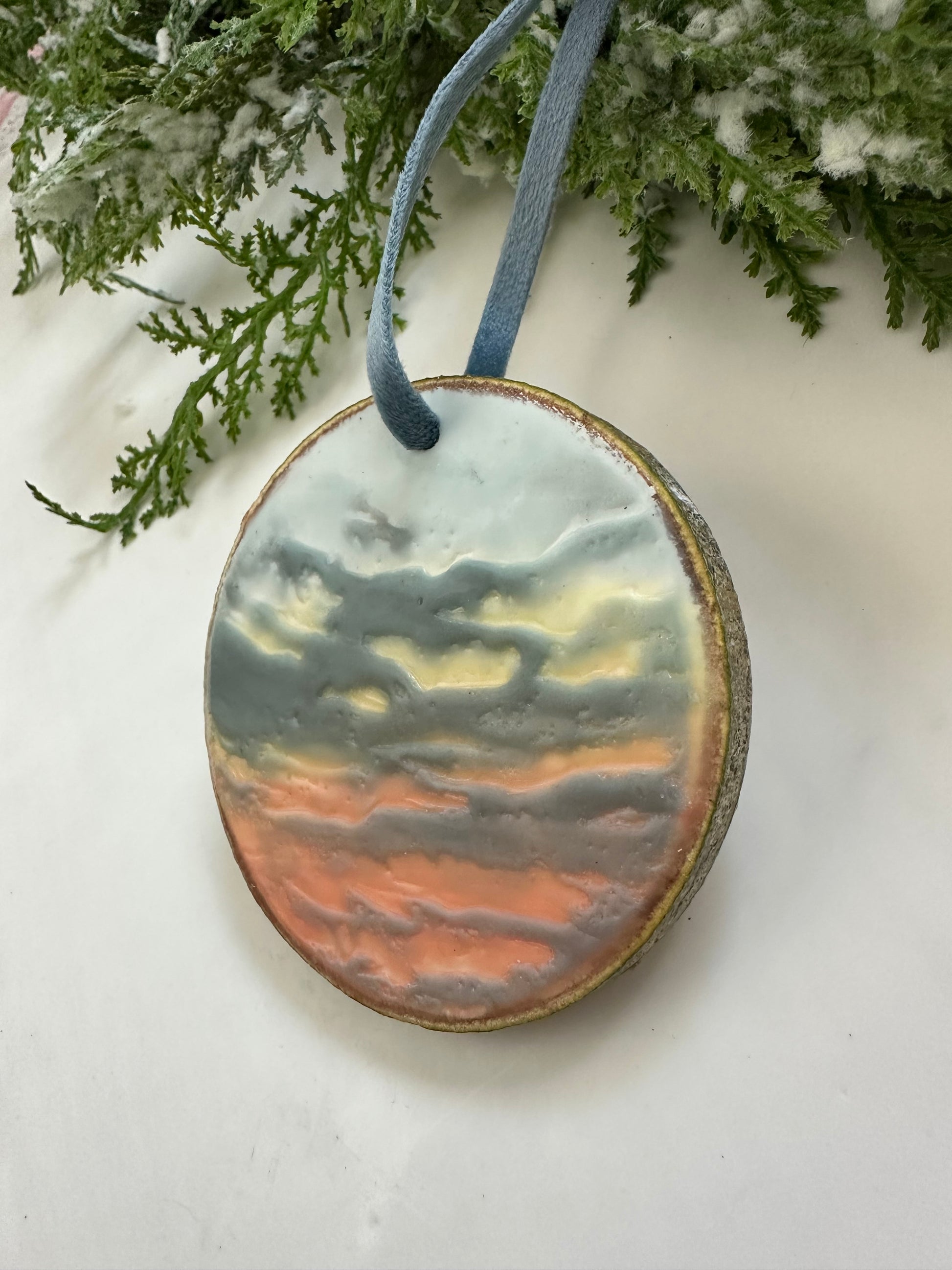 One-of-a-kind original hand-painted encaustic ornament on high-quality aspen wood rounds sourced from Aspen Rustic Creations. Dried and stabilized (so they won’t crack!), no two ornaments are exactly alike—each features its own original landscape of light in the water, waves, or clouds.