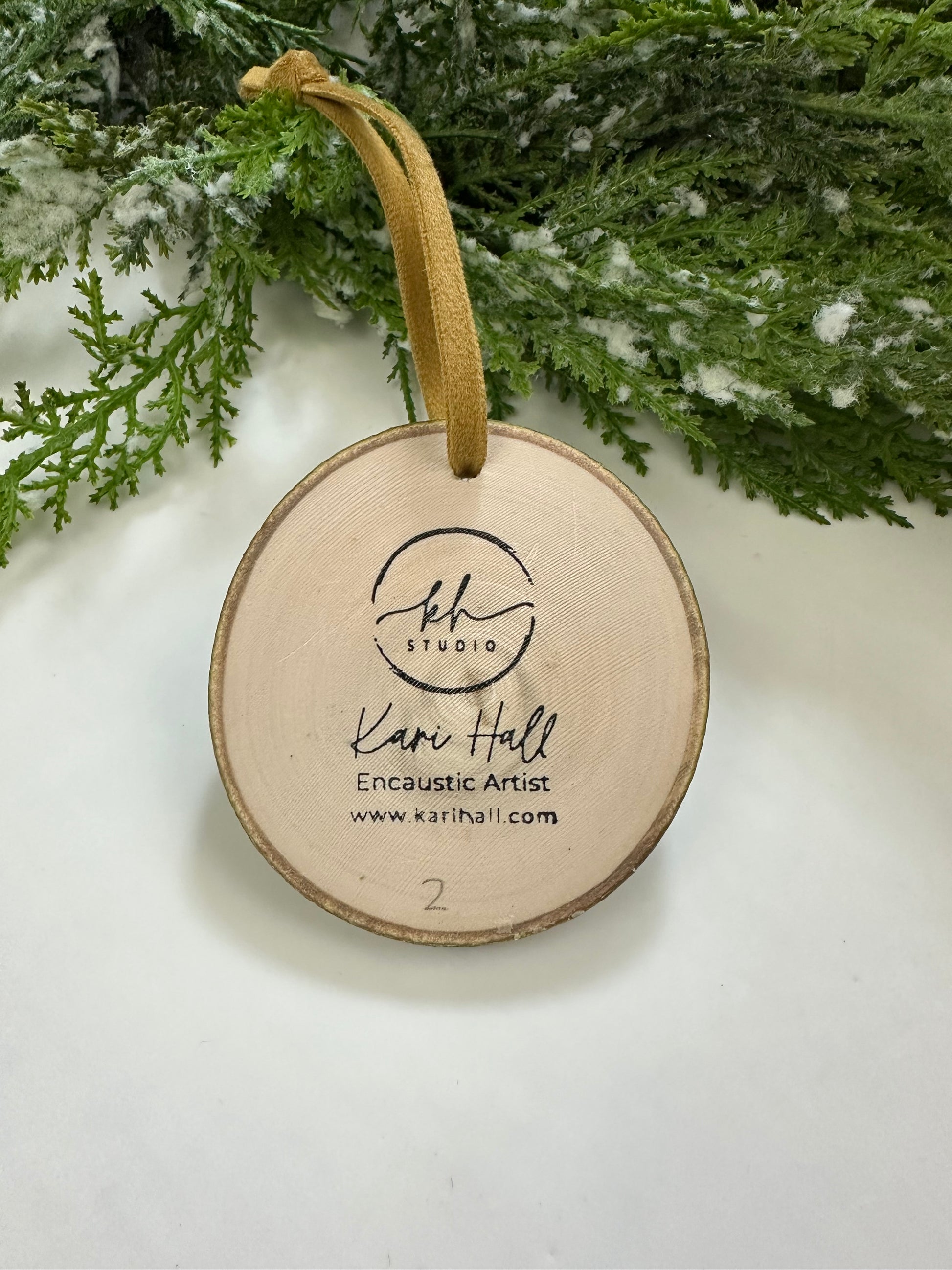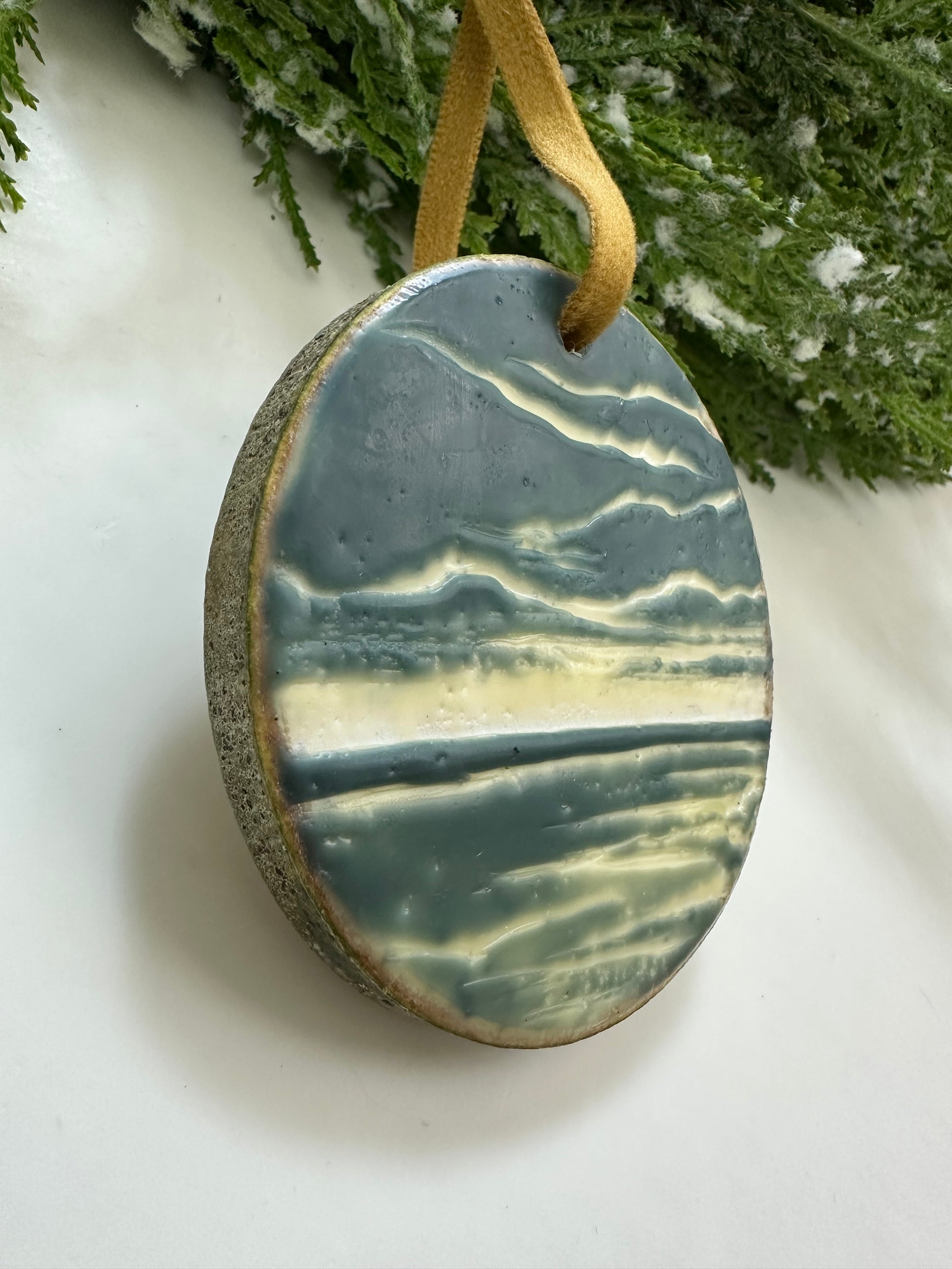 One-of-a-kind original hand-painted encaustic ornament on high-quality aspen wood rounds sourced from Aspen Rustic Creations. Dried and stabilized (so they won’t crack!), no two ornaments are exactly alike—each features its own original landscape of light in the water, waves, or clouds.