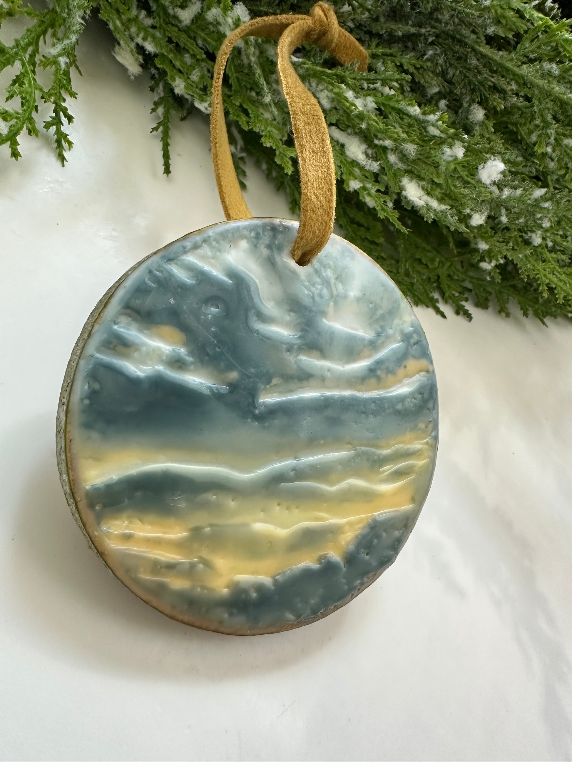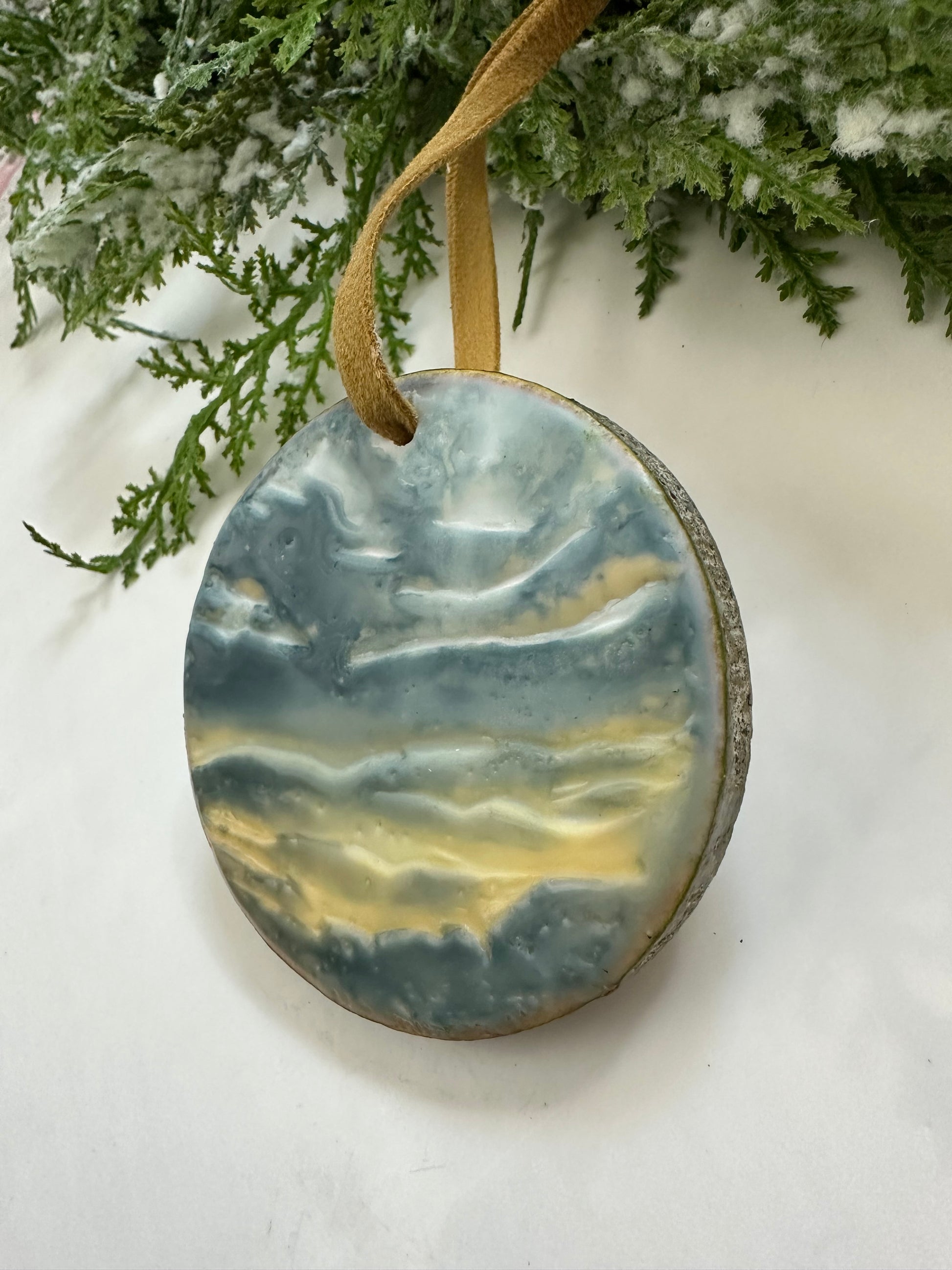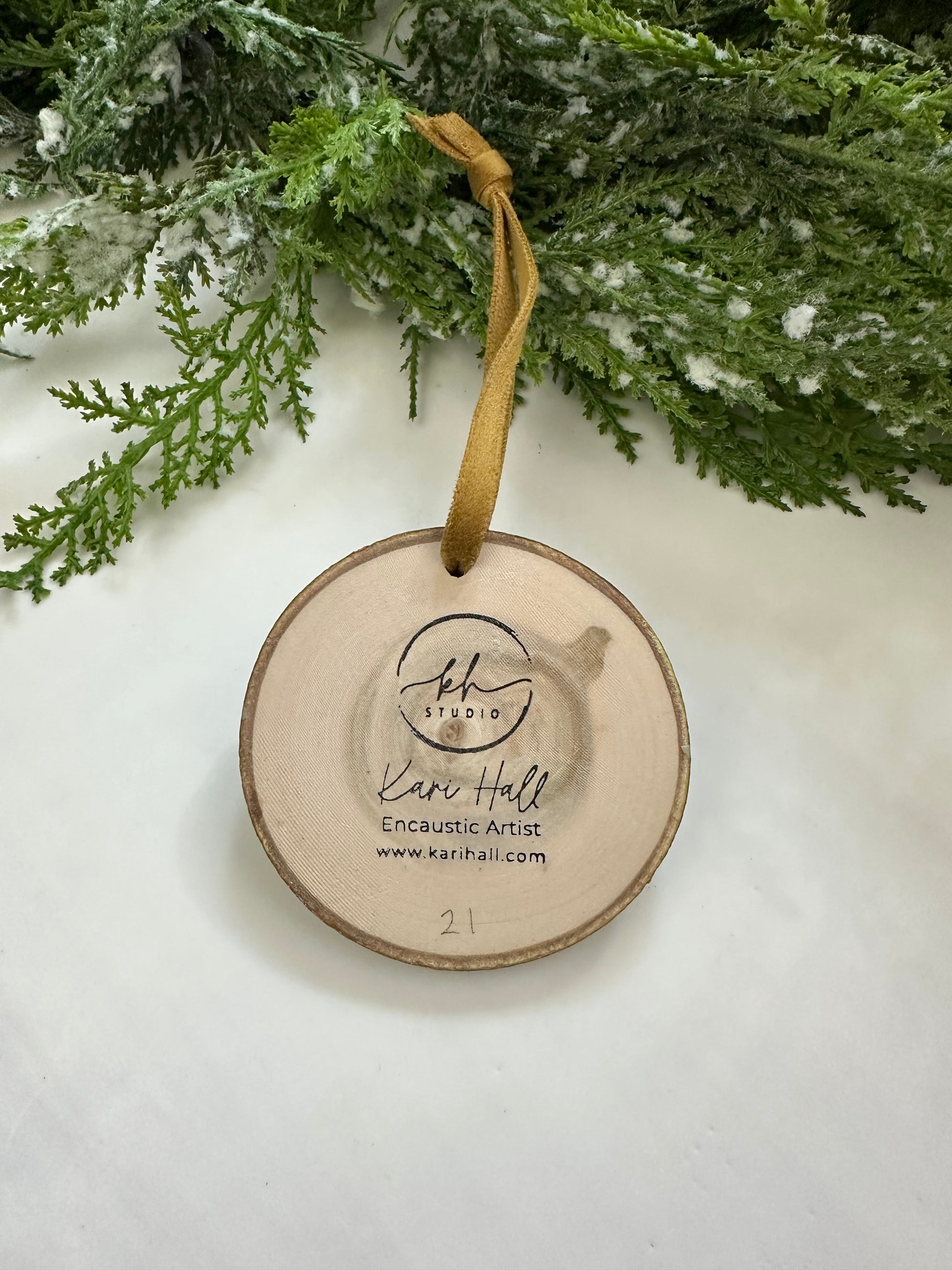 One-of-a-kind original hand-painted encaustic ornament on high-quality aspen wood rounds sourced from Aspen Rustic Creations. Dried and stabilized (so they won’t crack!), no two ornaments are exactly alike—each features its own original landscape of light in the water, waves, or clouds.