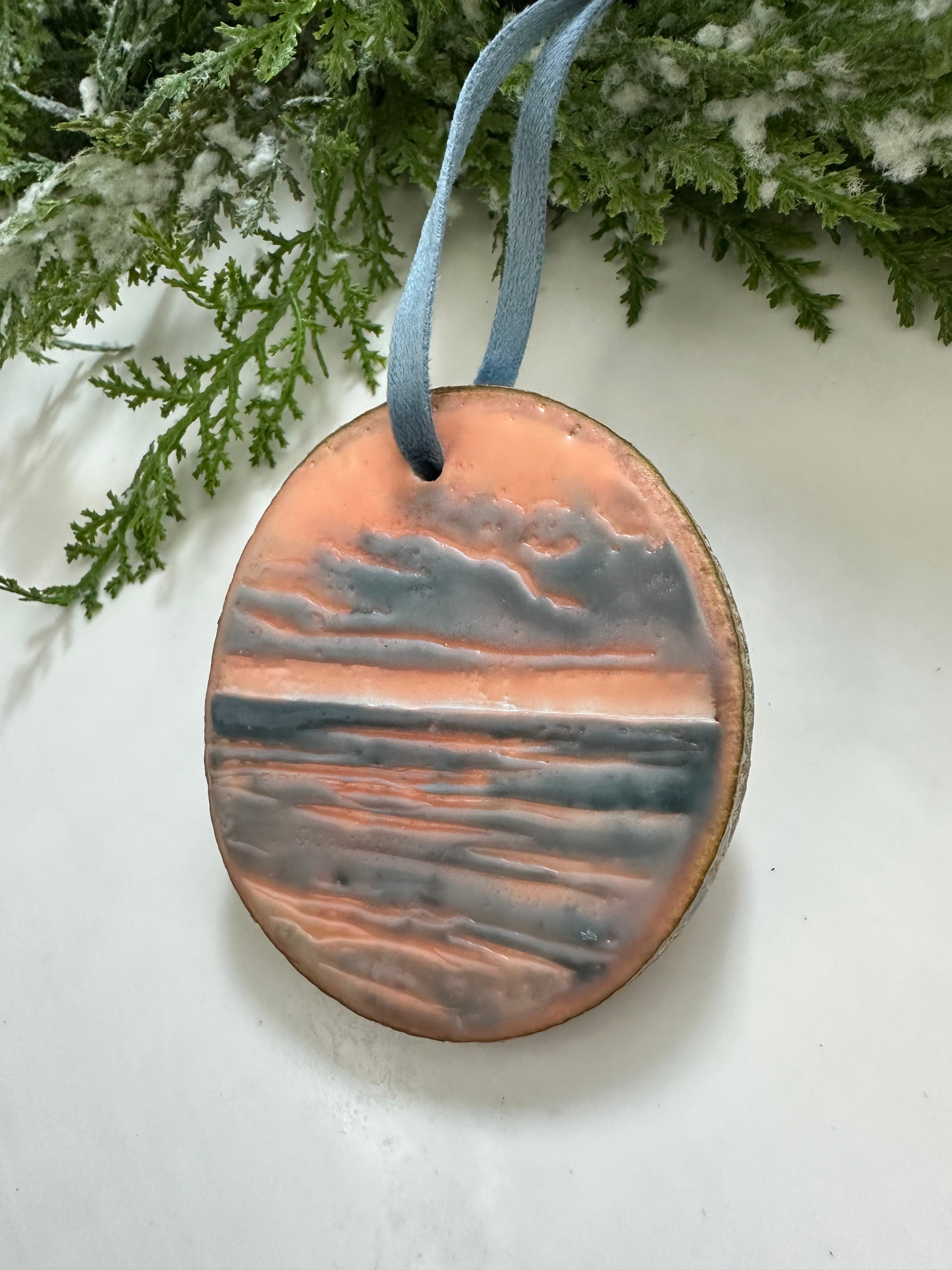 One-of-a-kind original hand-painted encaustic ornament on high-quality aspen wood rounds sourced from Aspen Rustic Creations. Dried and stabilized (so they won’t crack!), no two ornaments are exactly alike—each features its own original landscape of light in the water, waves, or clouds.