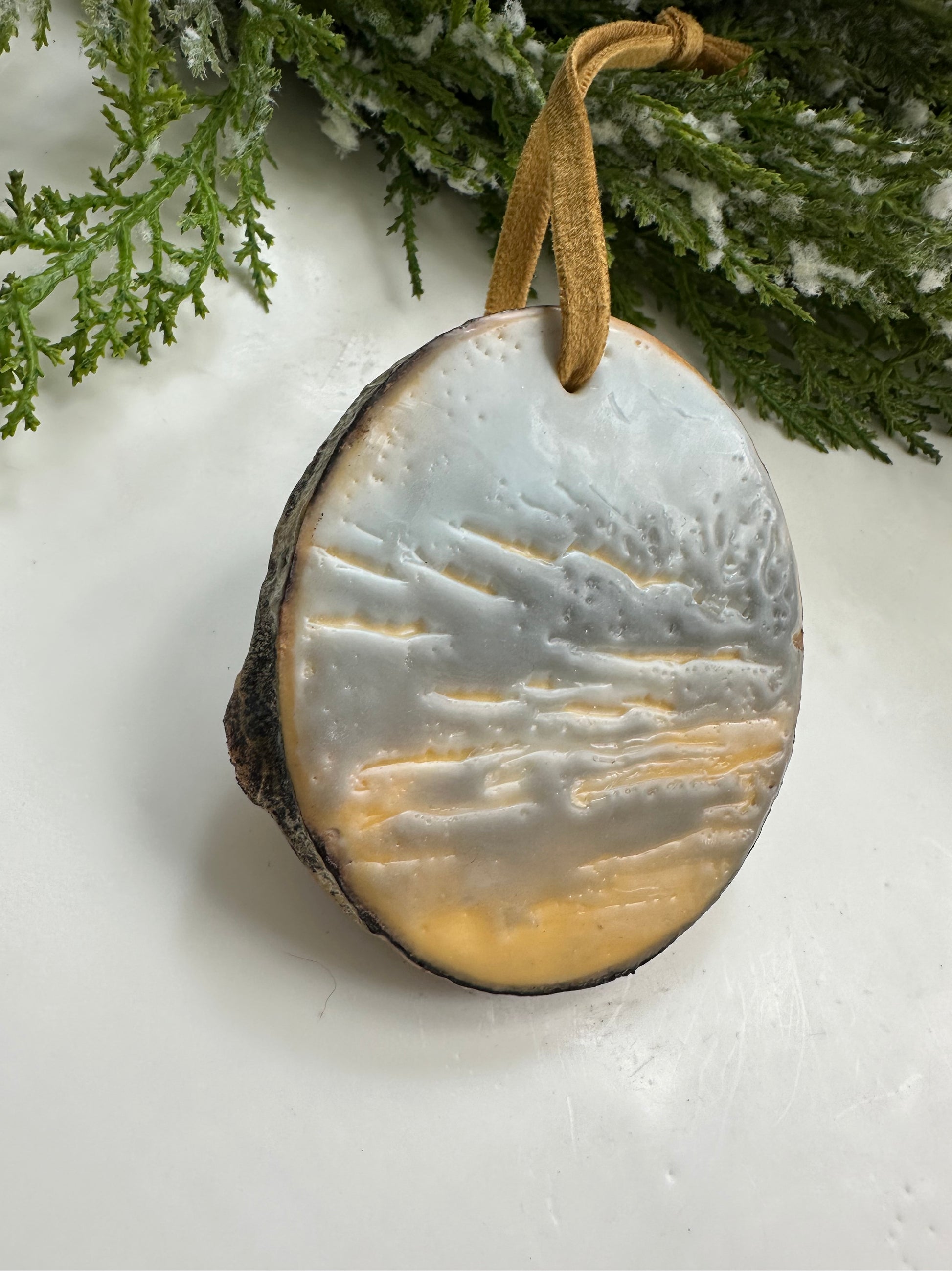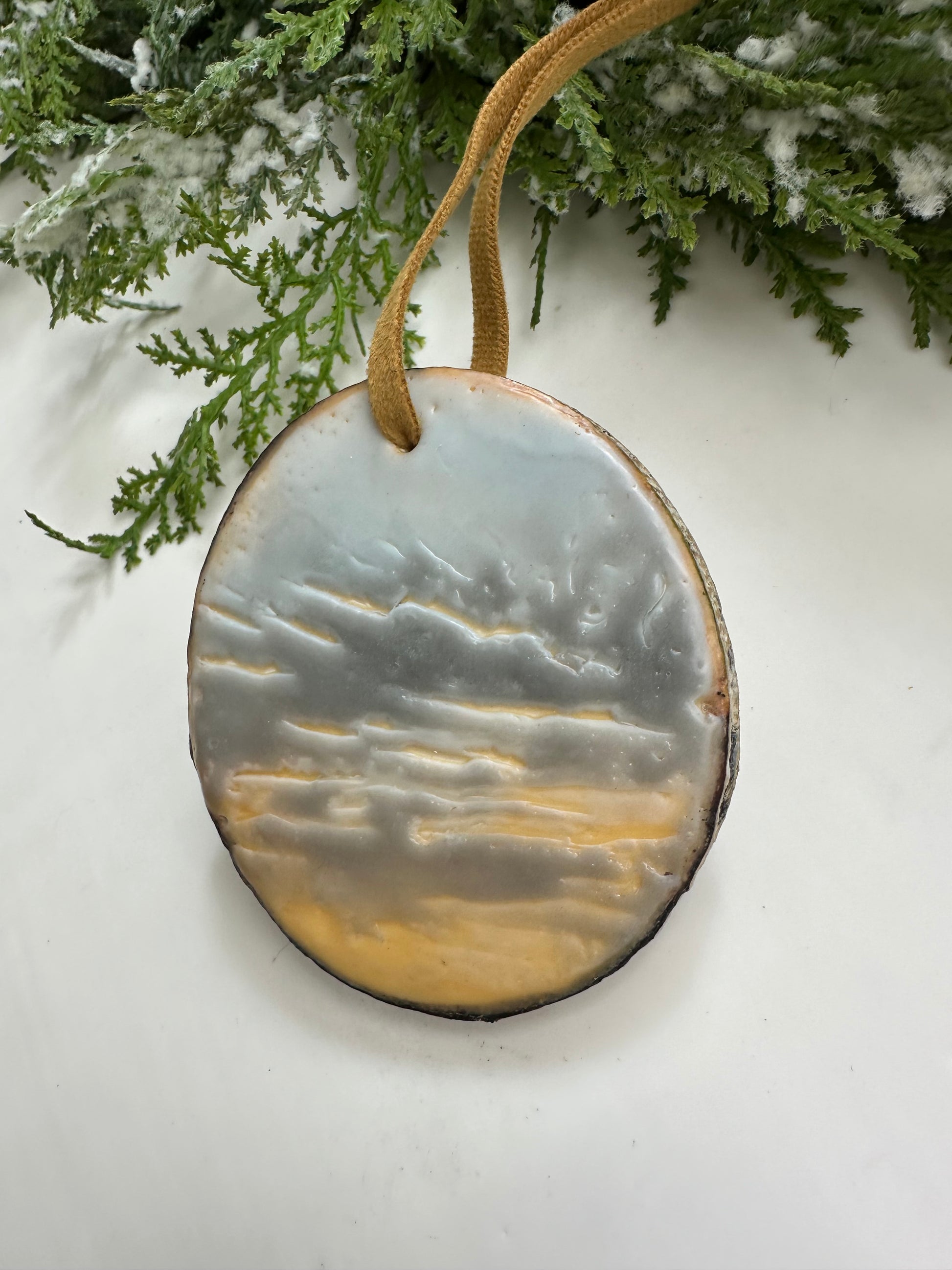 One-of-a-kind original hand-painted encaustic ornament on high-quality aspen wood rounds sourced from Aspen Rustic Creations. Dried and stabilized (so they won’t crack!), no two ornaments are exactly alike—each features its own original landscape of light in the water, waves, or clouds.