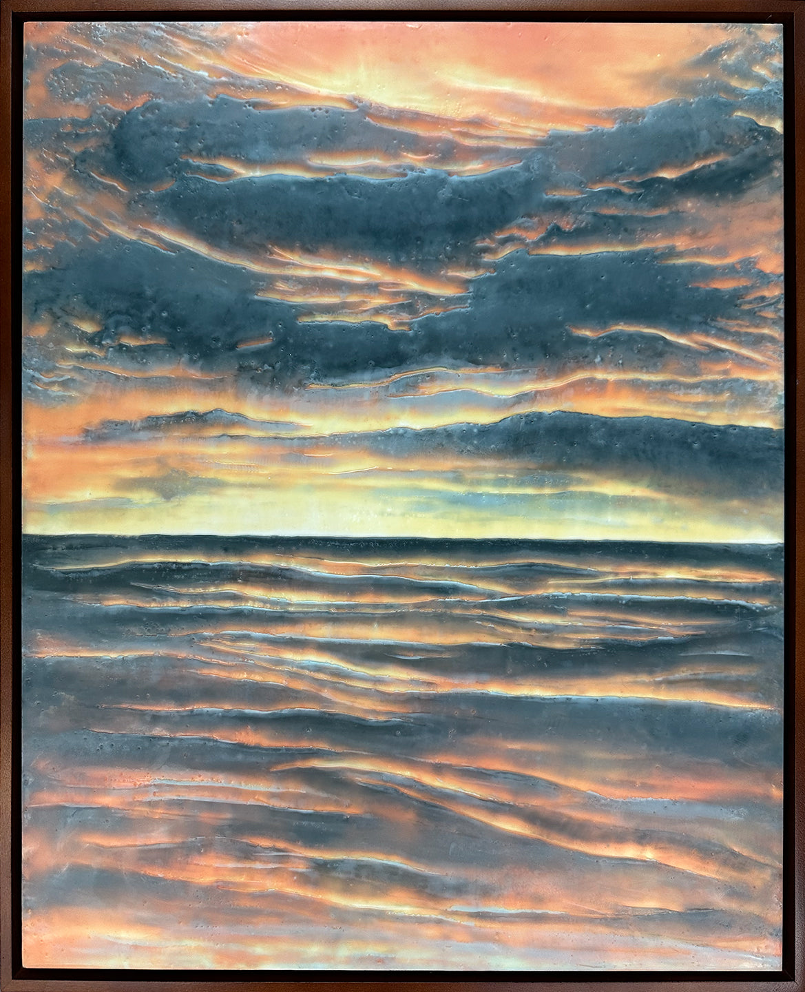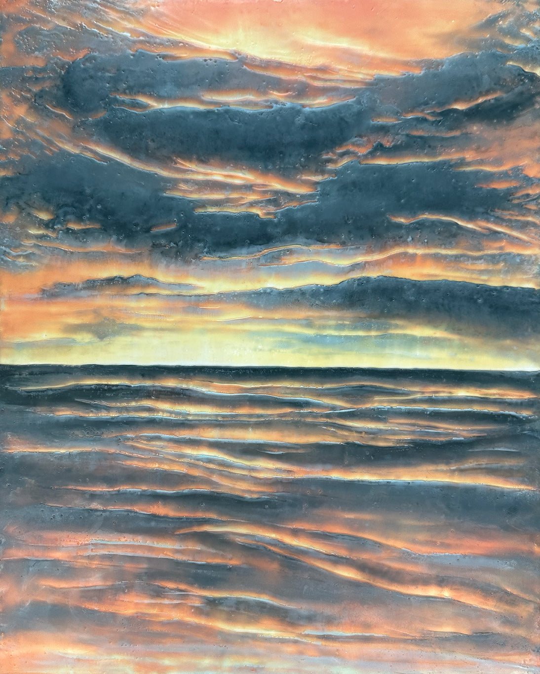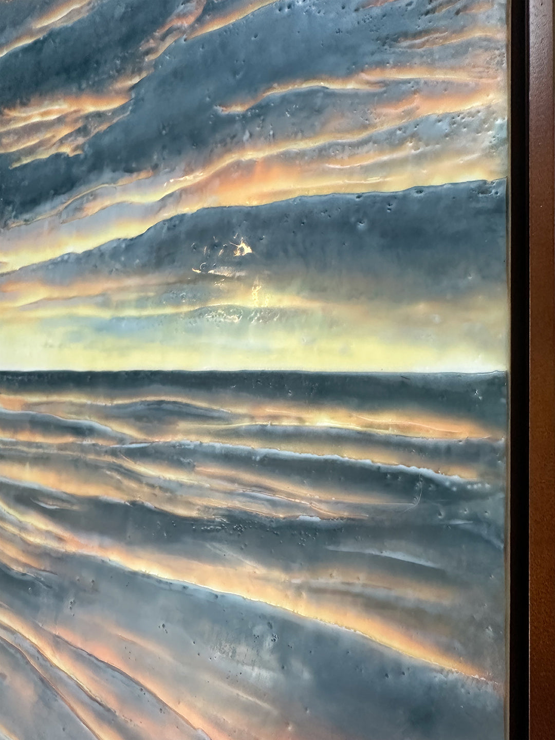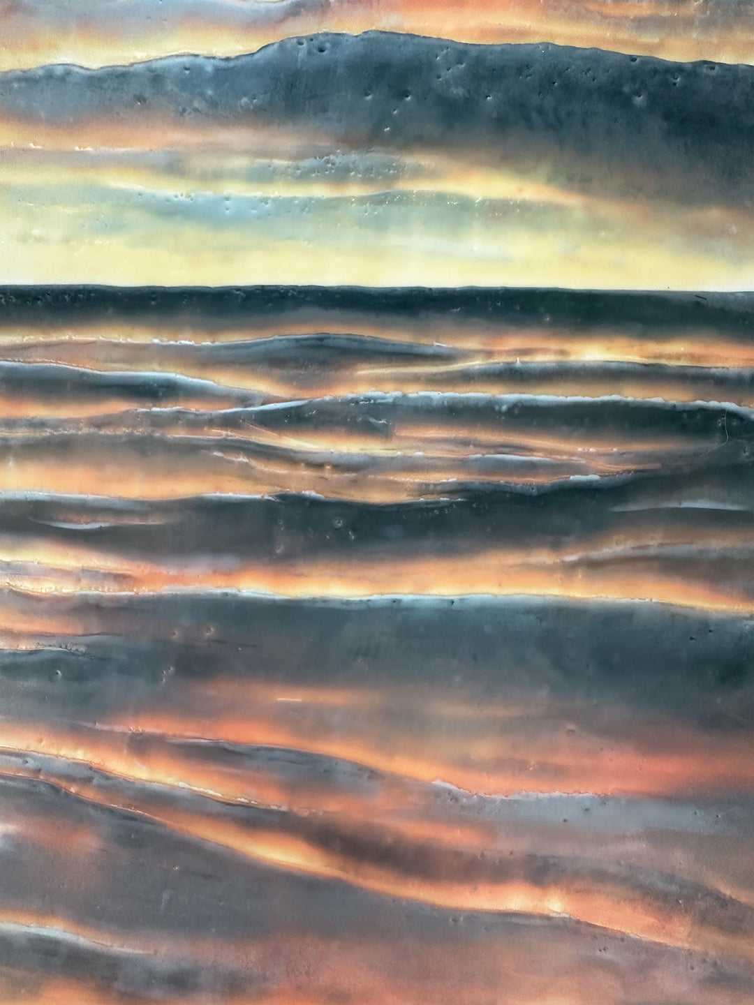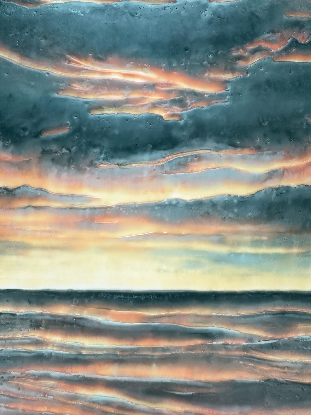 After completion of an encaustic painting there is a curing process of a few months. During this time moisture will work its way to the surface and cause a slight haze (this is called bloom). When the sheen dulls or looks dusty, it can be buffed (gently, firmly but not overly vigorous) to a high gloss using a soft lint-free cloth (similar to polishing or dusting furniture). The sheen dulls over time and can be brought back by repeating the process. Although the surface is completely dry, encaustic paintings can be easily scratched, gouged, or chipped if handled roughly. No fingernails please! Protect all encaustic from extreme heat (above 140 F) and freezing temperatures.