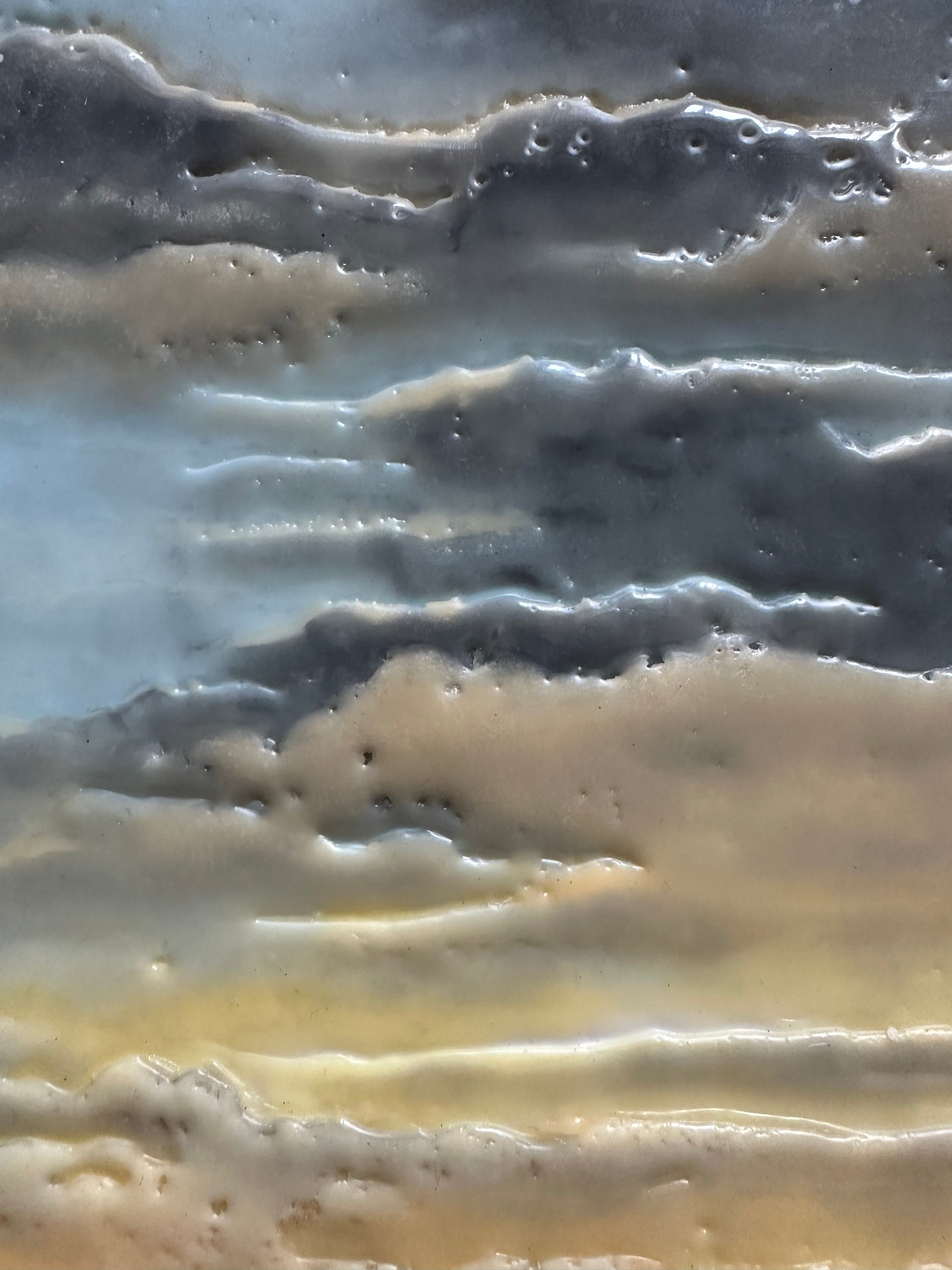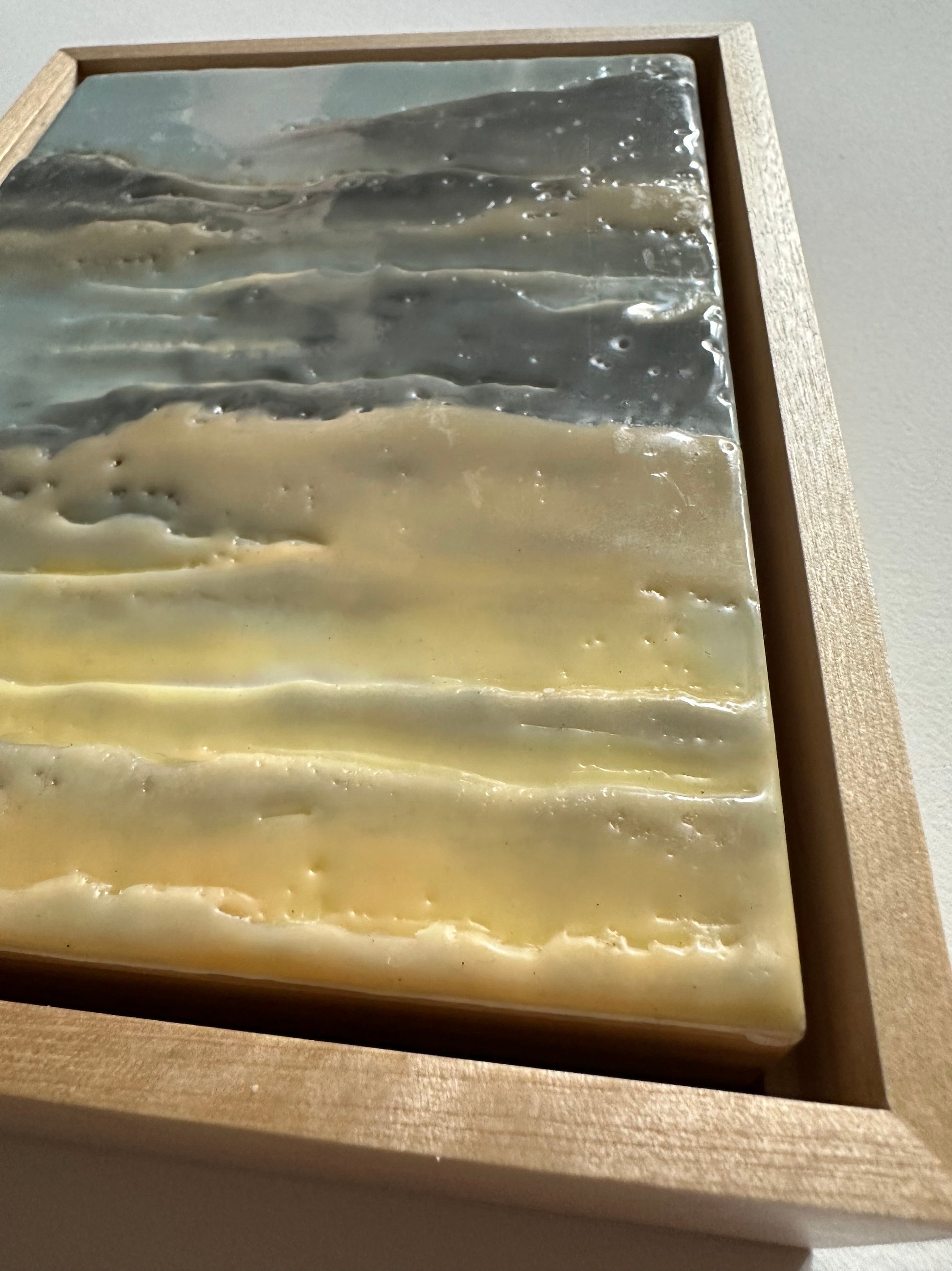After completion of an encaustic painting there is a curing process of a few months. During this time moisture will work its way to the surface and cause a slight haze (this is called bloom). When the sheen dulls or looks dusty, it can be buffed (gently, firmly but not overly vigorous) to a high gloss using a soft lint-free cloth (similar to polishing or dusting furniture). The sheen dulls over time and can be brought back by repeating the process. Although the surface is completely dry, encaustic paintings can be easily scratched, gouged, or chipped if handled roughly. No fingernails please! Protect all encaustic from extreme heat (above 140 F) and freezing temperatures.