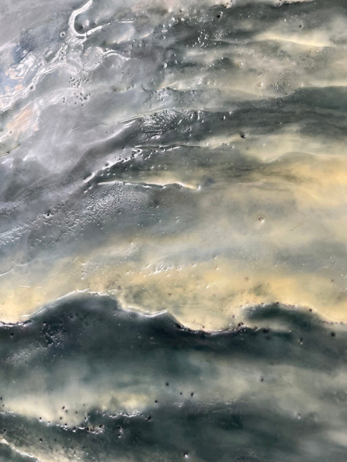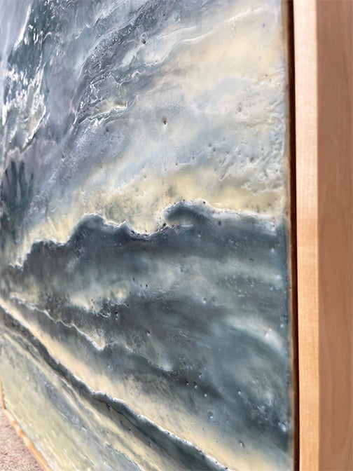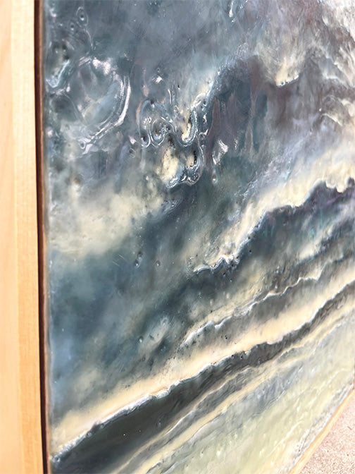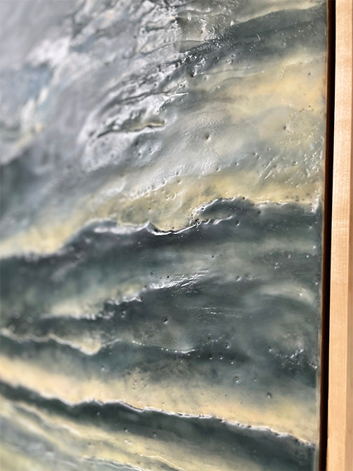 After completion of an encaustic painting there is a curing process of a few months. During this time moisture will work its way to the surface and cause a slight haze (this is called bloom). When the sheen dulls or looks dusty, it can be buffed (gently, firmly but not overly vigorous) to a high gloss using a soft lint-free cloth (similar to polishing or dusting furniture). The sheen dulls over time and can be brought back by repeating the process. Although the surface is completely dry, encaustic paintings can be easily scratched, gouged, or chipped if handled roughly. No fingernails please! Protect all encaustic from extreme heat (above 140 F) and freezing temperatures.
